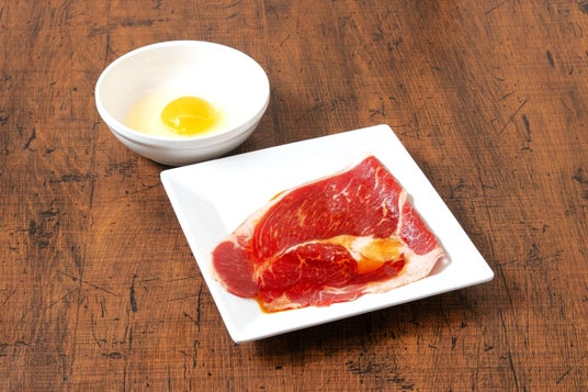 焼いたら溶いた玉子にくぐらせて、すき焼き仕立てでお召し上がりください。白米にダイブさせて食べるのもオススメです。