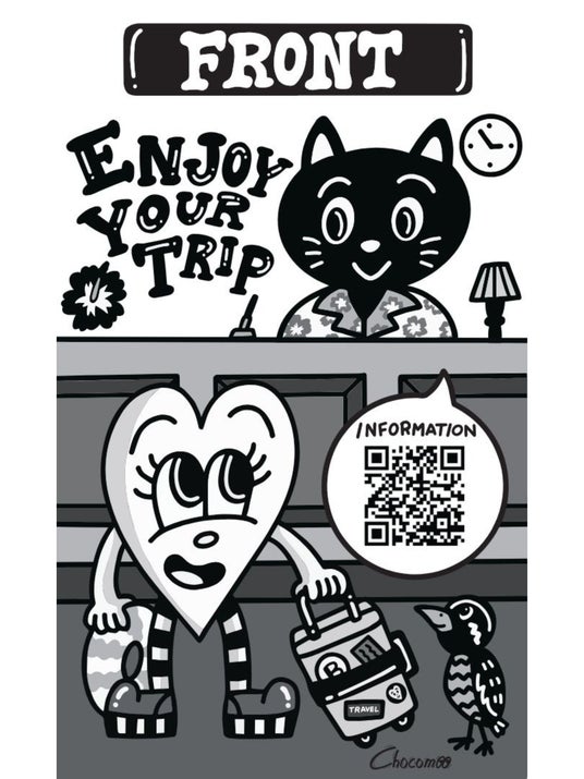 BEB5沖縄瀬良垣は、やんばるアートフェスティバルの参加アーティストであり、幅広い世代から支持を受けているChocomoo氏とコラボ。BEB5沖縄瀬良垣での滞在をイメージしたオリジナルのイラストが、パブリックスペース「TAMARIBA(タマリバ)」の窓ガラスや、インフォメーションカード、カフェのテイクアウトカップなどを彩ります。さらに、「TAMARIBA」の窓ガラスを彩るイラストは、Chocomoo氏による直筆です。館内の至る所で出会えるオリジナルデザインで、旅の気分が上がること間違いなし。
