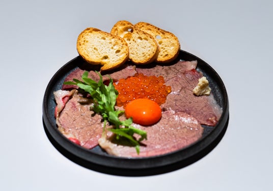 黒毛和牛の炙りカルパッチョ シラリカいくら、濃紅玉子、メルバ添え1,419円(税込)