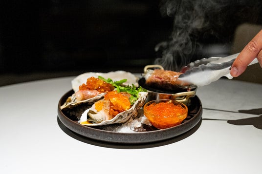 旬の生牡蠣に薄切り黒毛和牛サーロインを巻き、目の前でスタッフが鉄石で焼き上げます。たっぷりの「シラリカいくら」と鬼おろしポン酢と共に、食感や香りを楽しみながらお召し上がりください。