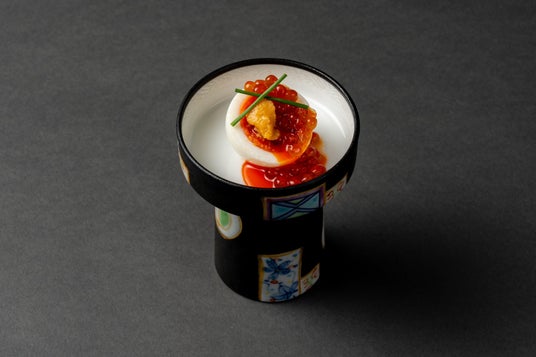 半熟に仕上げた濃紅玉子とウニを合わせ、上からたっぷりの「シラリカいくら」をかけました。柚子の香りがアクセントになっています。