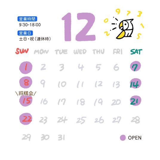 年内の最後の営業日は12月22日(日)となります。12月の営業日カレンダーをご確認の上ぜひご来店ください!