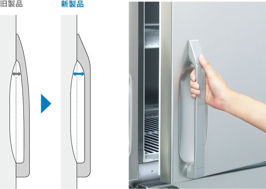 ● ドアの開閉をスムーズにおこなえるよう、ハンドルの手前部分を曲線から直線的な形状に変更し、