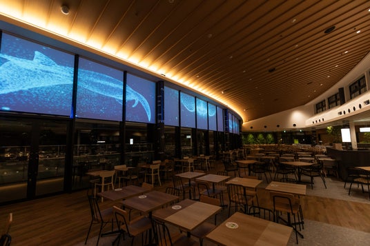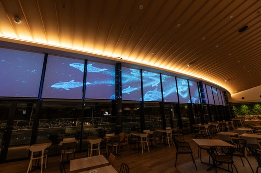今回実証実験を行う「フードロッジ」は、多国籍な12店舗が出店し、ソファ席、親子席、電源コンセント付きカウンター席など多様なニーズに対応する約800席を備えています。日中は施設の広場を一望し、開放感のある約25m幅の窓には、日没からプロジェクションマッピングが投影され、幻想的な空間に様変わりします。現在は、深谷市の豊かな自然や花々をテーマとしたアートコンテンツと、イルカやクジラなどの海の生き物が泳ぎ回る臨場感たっぷりのコンテンツをご覧いただけます。