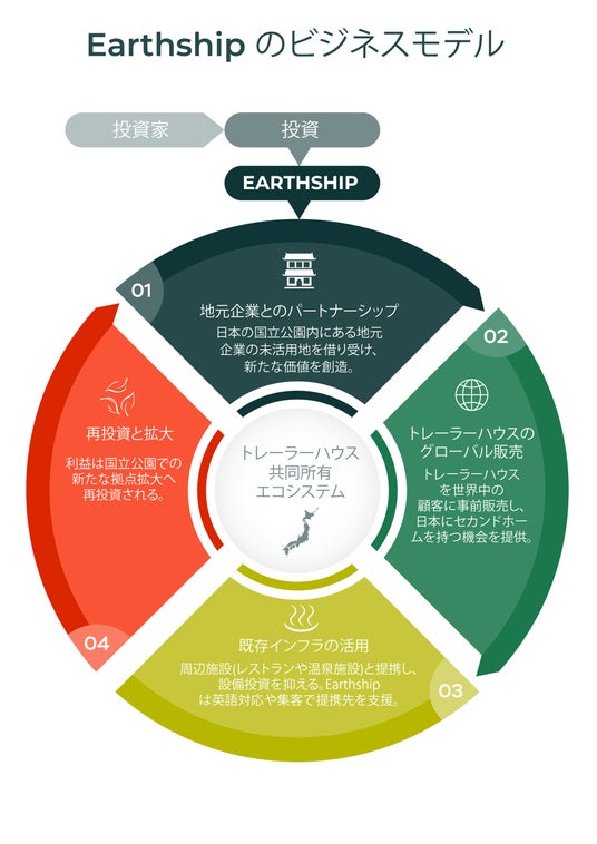 Earthshipのビジネスモデルは、アセットライト、オペレーションライト、スタッフライトを基盤とした、効率的でスケーラブルな仕組みです。大規模な資本投資や複雑な運営体制を必要とせず、地域と共に成長できる柔軟性を備えています。