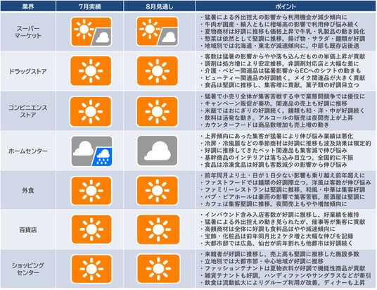 猛暑による影響が様々なリテイルに出ています。以前は、猛暑になると内食拡大に有利と言われていましたが、近年は調理の敬遠を招き、外食が伸長する傾向にあります。調理を避けるという点で中食も堅調に推移する傾向があり、内食・中食・外食のシェアでは以前ほど内食圧勝という傾向はみられません。猛暑になるとデリバリーも利用が拡大する傾向にありますが、直近の動きではやや上昇も際立った伸びにはなっていません。