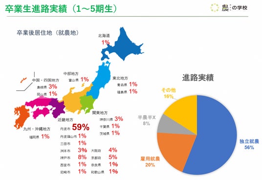 全国から受講生が入学する農の学校では、卒業後の就農地選択は全国どこでも自由だが、毎年約6割の卒業生が丹波市を選ぶ。1年間この学校で学びながら暮らすうちに、丹波で自分らしい農業を見つけ、地元で様々なつながりを得て、新たな一歩を踏み出しているものと分析している。