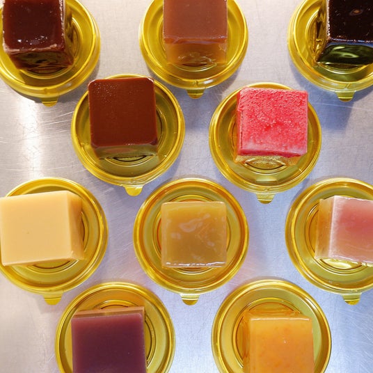 キュベ(キューブ型の羊羹)旬の果実、なにわの伝統野菜、スパイス、ハーブを使ったものや、キャラメルやモンブランなど洋菓子の要素を加えてアレンジしたキュベなど合わせて100種類以上の中から、季節ごとにラインナップを変えてご用意しております。