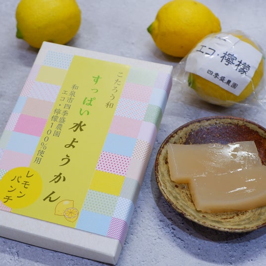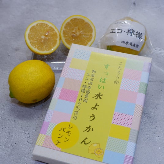 このすっぱい水ようかんにはエコ農産物の認定を受けた大阪府和泉市にある四季盛農園さんの「エコ・檸檬」を使用させていただいております。四季盛農園さんは江戸時代から続く歴史ある農家さんで、平成5年には農林水産大臣賞も受賞されています。寒暖差の大きい和泉市で育てられたレモンはほのかな甘みとコクがあり、味が濃いのが特徴。