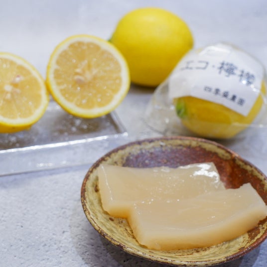 薬品の使用を極力抑えていることから皮まで食べられるほど安全安心なエコ・檸檬ですが、今回の水ようかんには滑らかな舌触りを重視し、贅沢にも果汁だけを入れて作らせていただいております。