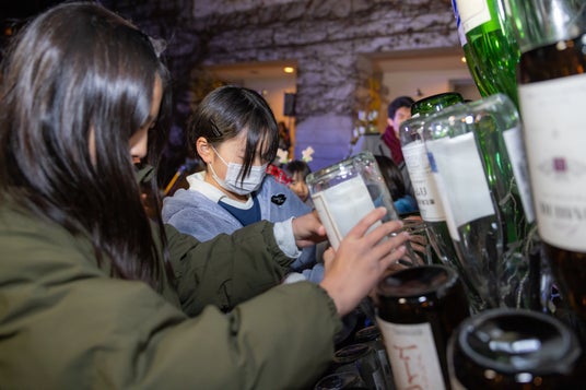 今年のテーマは「山梨ワイン」です。山梨県の葡萄農家では古くから、販売しない自家用のワインを一升瓶にいれて保存していたことにちなみ(*1)、施設内のレストランや近隣のワイナリーから集めた一升瓶のワインボトル(*2)のみをアップサイクルした高さ3.5mのメインツリーを、小学生14名が土台に差して完成させました。完成後、参加者のカウントダウンの合図でワインボトルが一斉に点灯し、輝く景色を思い思いに楽しみました。
