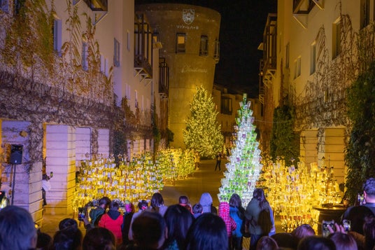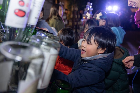 自然豊かな八ヶ岳エリアのリゾートホテル「リゾナーレ八ヶ岳」では、2024年11月29日に1万2千本のワインボトルが輝く「ワインリゾートクリスマス2024」点灯式を実施しました。6年目の開催となる「ワインリゾートクリスマス2024」の開始を祝い、今年は地元の小学生14名を招待。今年新登場の一升瓶のワインボトルのみをアップサイクルした高さ3.5mのメインボトルツリーの土台に、小学生たちが一升瓶のワインボトルを差し、1万2千本のワインボトルツリーが完成しました。参加者のカウントダウンの合図でワインボトルが一斉に点灯し、点灯の瞬間には歓声が沸きました。