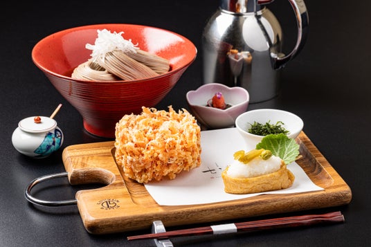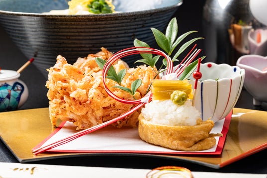 海老は「長寿」「成長」「発展」「運気の強さ」などの象徴であると言われています。また、紅白の模様がおめでたいということで“ハレの日”によく食されています。そこで、ご家族やグループでの食事の機会が多くなる年末年始に、お客様のご多幸を願って「桜海老」の掻き揚げ付きランチをご用意しました。たっぷり約700gの桜海老を使用した掻き揚げは、香ばしくボリューム満点。蕎麦、うどん、丼とどんな品にもよく合います。