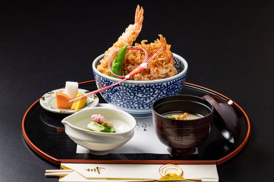 成長や長寿の象徴の海老天と桜海老の掻き揚げ丼。「運気が“あがる”掻き揚げ」で、2025年に弾みをつけるランチです。御飯は、白御飯・十八穀米からお選びいただけます。