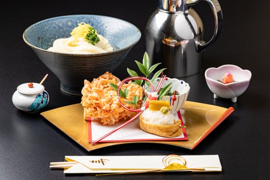 新しい年の到来を祝う「年明けうどん」。桜海老の掻き揚げを添えて「白い饂飩に赤い桜海老の紅白」のおめでたい紅白ランチです。