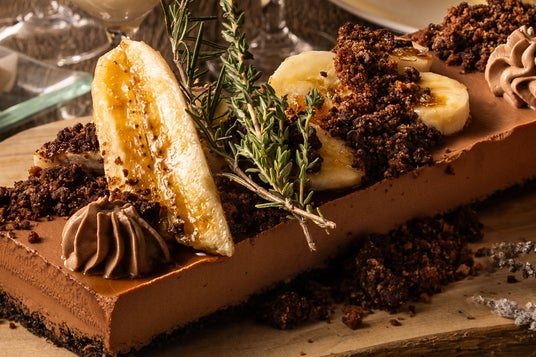 キャラメリゼしたバナナのムースを軽い食感のチョコムースと合わせ、ココアクッキーを砕いて散りばめることで、味と食感に変化をつけています。