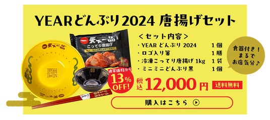 セット内容:YEARどんぶり2024/ロゴ入り箸/冷凍こってり唐揚げ1kg/ミニミニどんぶり黒/【価格:税込12,000円 ※送料無料】