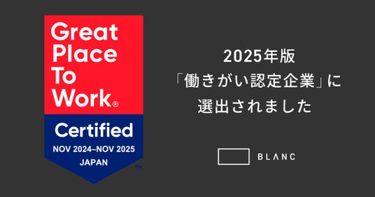 株式会社BLANC(本社:東京都港区、代表取締役社長:山中 拓也、以下BLANC)は、このたび、Great Place to Work(R) Institute Japan(本社:東京都港区、代表取締役社長:荒川 陽子、以下GPTW Japan)が実施する2025年版「働きがいのある会社」調査において、「働きがい認定企業」に選出されました。