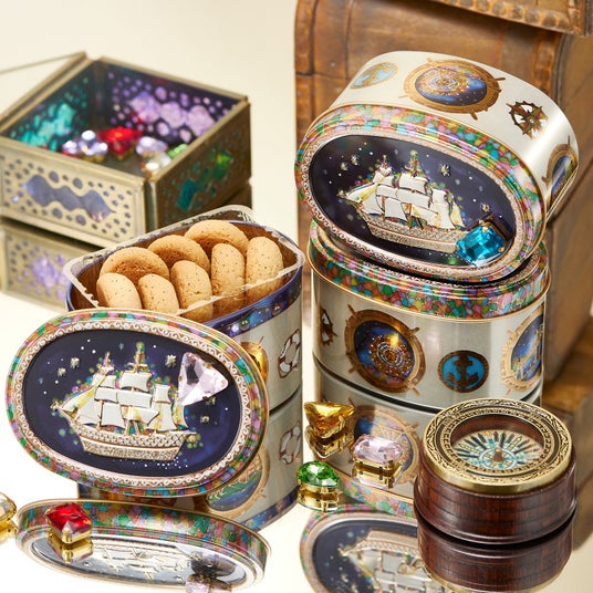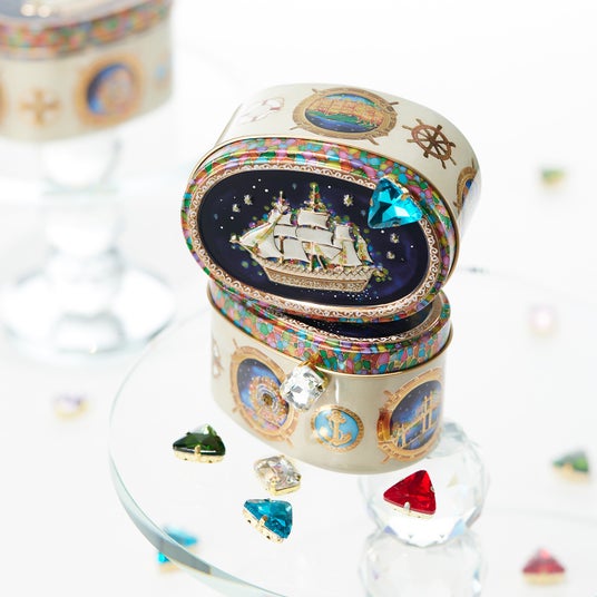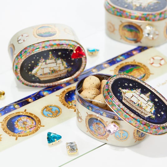 『東京駅缶』『お城缶』に続き、グラスペイントアーティストのAlisa Horitaが『横浜缶』のイラストを手掛けました。蓋面には夜の帆船を大きくデザインしました。Alisa Horitaのイメージで作り上げられた帆船には、グラスペイントの美しさが際立つ繊細な模様が描き込まれています。