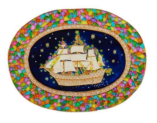 横浜×船×ガラス絵。横浜の夜に煌めく仄かな灯り