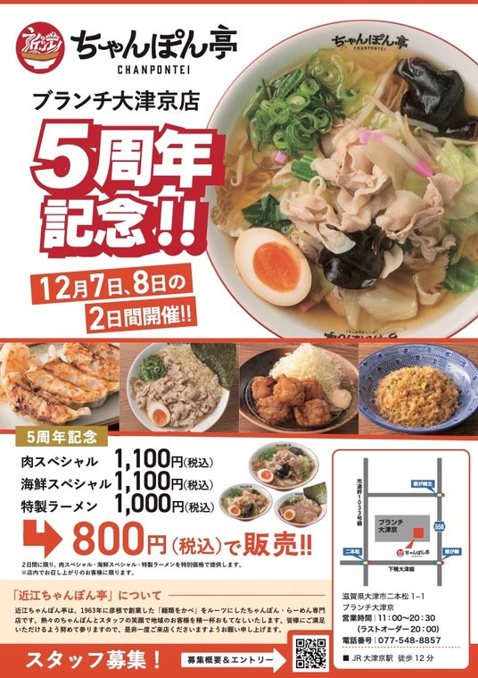 滋賀県を拠点に展開するドリームフーズ株式会社(本社:滋賀県彦根市、代表取締役:山本英柱)は、「近江ちゃんぽん亭 ブランチ大津京店」の開店5周年を記念し、2024年12月7日(土)・8日(日)の2日間限定で特別感謝イベントを開催します。