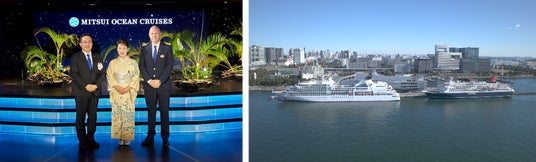命名記念式典が行われた東京国際クルーズターミナルには商船三井クルーズの新たなクルーズブランド「三井オーシャンクルーズ」傘下のもう1隻のクルーズ船「にっぽん丸」も着岸しました。同社が保有する複数隻のクルーズ船が同時に着岸してデビューを祝うのは1990年のにっぽん丸(現在運航中の3代目)の就航時以来です。当時、にっぽん丸のデビューを祝うために「ふじ丸(1989-2013)」が横に並びましたが、今度はにっぽん丸が、ふじ丸の名を受け継ぐ三井オーシャンフジの門出を祝いました。