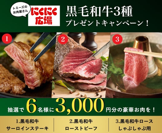 「にくにく広場」オープンを記念して、トミーズの公式Xではプレゼントキャンペーンを実施。黒毛和牛3,000円分を6名の方に抽選でプレゼントします。