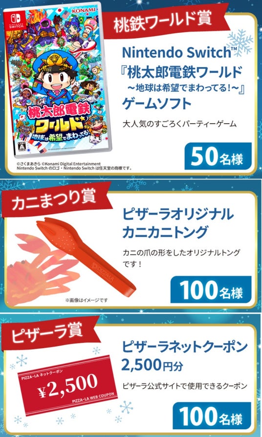 豪華賞品は、ピザーラ仕様のSL「ピザーラお届け号」も登場しているNintendo Switch(TM)用ゲームソフト「桃太郎電鉄ワールド ~地球は希望でまわってる!~」、冬のカニピザ発売にちなんだ「ピザーラオリジナル カニカニトング」、ピザーラ公式サイトで使用できる2,500円分のネットクーポンなど!