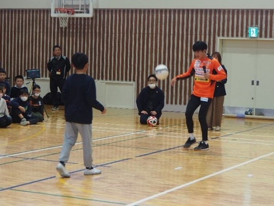 当日は、白石小学校卒業生である末永透瑛選手が参加し、小学生時代の思い出やサッカーを始めたきっかけなどの話に加え、食生活で気を付けていることやお菓子を食べるタイミングなどアスリートの食事への意識などを子どもたちに伝えました。また、末永選手がリフティングやシュート練習を披露し、質問コーナーでは、子どもたちから「試合で意識していること」や「サインに込められた想い」といった質問があがるなど交流を深めました。
