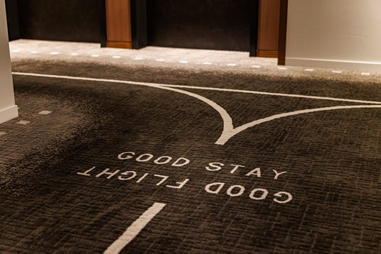 羽田空港の滑走路をイメージした客室廊下のカーペットをモチーフにしています。また、エレベーターホールの床に施された「GOOD STAY」と「GOOD FLIGHT」というメッセージも、お客様の快適な宿泊と安全な旅を願う思いを込めてデザインに取り入れました。さらに実際のフライトタグ同様に「REMOVE BEFORE FLIGHT」を当ホテルのロゴと共に表現しました。