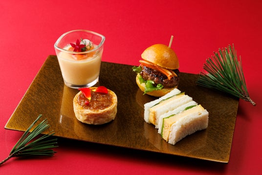 雲丹を入れた茶碗蒸しや、干し柿の甘さとポークリエットの塩気の相性が抜群のタルト、ビーフ100%のパテを使ったバーガー、大葉がアクセントのだし巻き卵サンドをご用意しました。