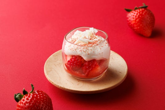 いちごシロップを染み込ませたスポンジ、古都華の果肉、マスカルポーネでつくったクリームに、いちごのパウダーをふりかけました。