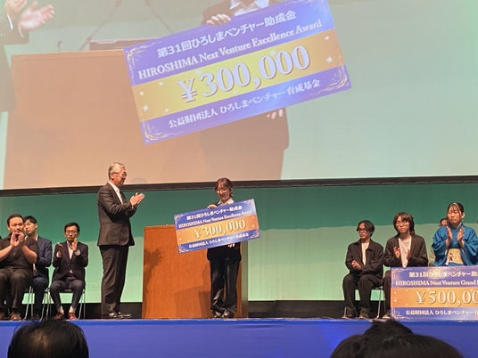 「第31回ひろしまベンチャー助成金」は、広島県内の新規性・独創性のある技術やビジネスプラン等を有しており、事業を中期的に拡大・発展させる意思を持った法人または個人に助成されるものです。今回、成毛さんは学生枠29件の応募の中から、「HIROSHIMA Next Venture Excellence Award」を受賞し、30万円の助成金を獲得しました。