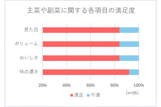 巻石堂病院の入院患者様25名を対象にアンケート調査を実施しました。その結果、「おいしさ」「味の濃さ」「ボリューム」「見た目」などのすべての項目で満足度が80%を超え、大変高い評価をいただきました。
