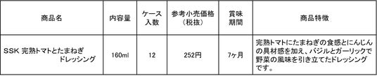 エスエスケイフーズ株式会社(本社:静岡市葵区)は、日頃ご愛顧いただいている「SSKドレッシング」に新味として「SSK 完熟トマトとたまねぎドレッシング」を発売致します。