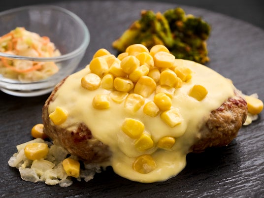 副菜のコーンバターをハンバーグに乗せていただくことで、コーンの食感と甘味がプラスされ、より一層コーンの美味しさを味わっていただけます。