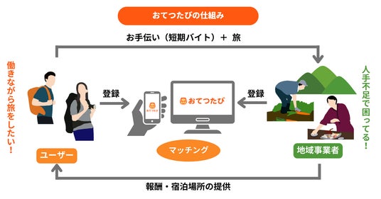 「お手伝い(短期アルバイト)」と「旅」を組み合わせた人材マッチングサービスです。