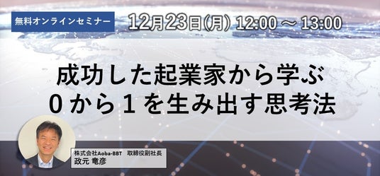 本セミナーでは、Aoba-BBTが26年間にわたり培ってきた社会人教育の経験をもとに、数多くの起業家を輩出してきたノウハウを公開します。これまでに800社以上の企業がAoba-BBTから誕生し、そのうち20社はIPOを果たしています。本セミナーでは、成功した起業家たちが持つ「0から1を生み出す」独自の思考法を、実際の事例を交えながらご紹介します。