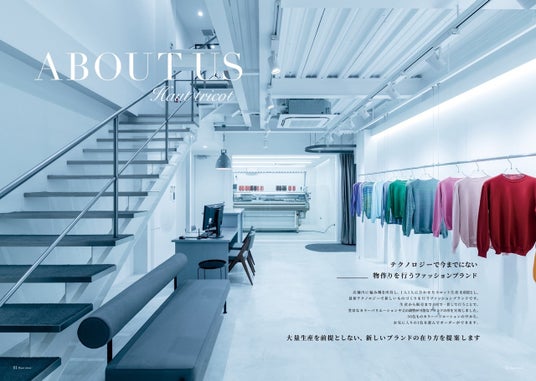 店舗内に(株)島精機製作所のホールガーメントテクノロジーを導入し、サプライチェーン不要ですべて自社で生産が完結する洋服作りを行っている。