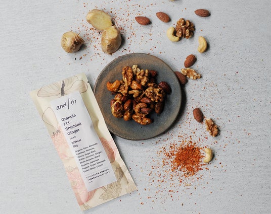 and/or (アンドオア) は、江戸情緒が今も残る台東区・上野桜木に店舗を構えるグラノーラ専門店。地理的共通点をきっかけに、「新しい食習慣をデザインする」という理念のもと、蔦屋重三郎が生涯をかけて挑んだ「新しい価値の創出」という姿勢に共感し、江戸文化へのリスペクトと独自の革新性を掛け合わせた「和グラノーラ」を開発しました。