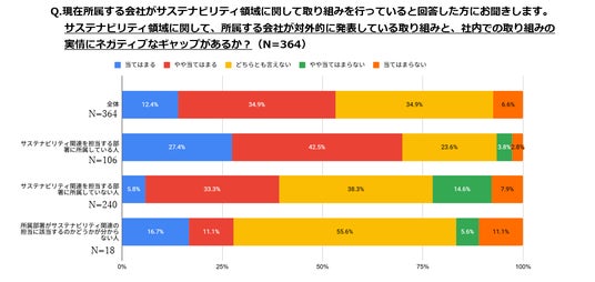 2つ目の質問項目(会社の対外的な発表内容と社内での取り組みの実績にネガティブなギャップを感じているか?)に「当てはまる」と回答をされた人の割合は、サステナビリティ関連部署の人の27.4% に対して、サステナビリティ関連部署外の人は 5.8%に留まります。