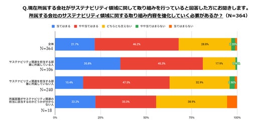 自身の所属する会社でサステナビリティ領域に関する何らかの取り組みを行っている方(364人)に、会社のサステナビリティ領域の取り組みに思うことをお聞きしたところ、