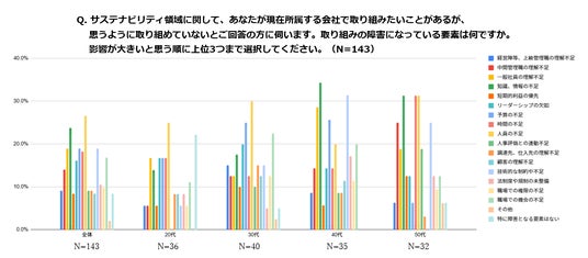 サステナビリティ領域に関して現在所属する会社で取り組みたいことがあるが思うように取り組めていないと回答された方々に対して、サステナビリティの取り組みの障害になっている要素をお聞きしたところ、年代によって異なる傾向が現れました。