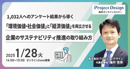 今回の「企業のサステナビリティに関するアンケート」調査結果の解説と、「環境価値・社会価値」と「経済価値」を両立させる企業のサステナビリティ推進の取り組み方をご紹介するオンラインセミナーを2025年1月28日に開催します。
