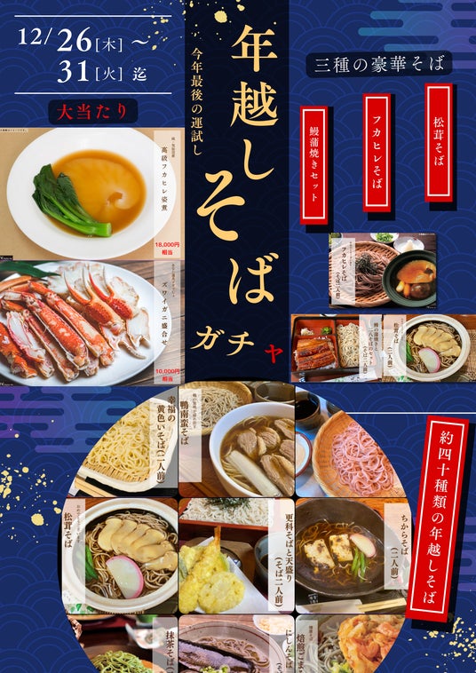 内容:天ぷらそばや鴨南蛮、恋愛運が上がる「幸福の黄色いそば」等、約四十種類の様々な年越しそばから1/50の確率で国産鰻蒲焼きセット、松茸そば、フカヒレそばの豪華三種年越しそばが当たる仕様となっています。