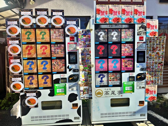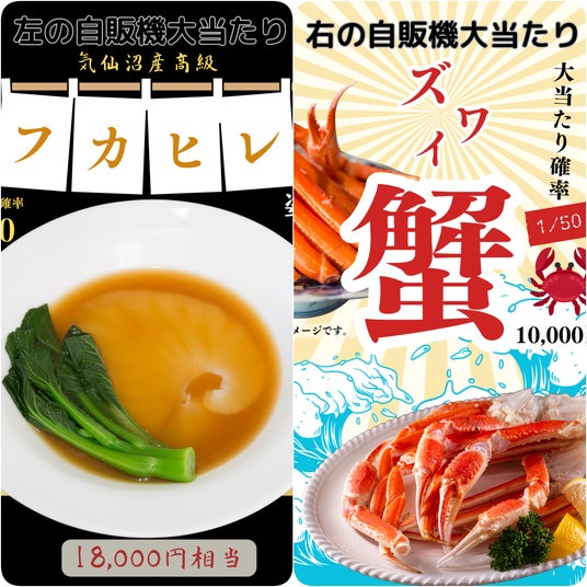 左がフカヒレ自販機(1回1,200円)、右がズワイガニ自販機(1回1,000円)