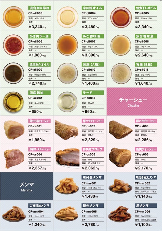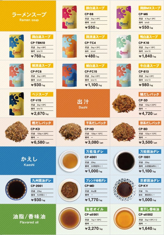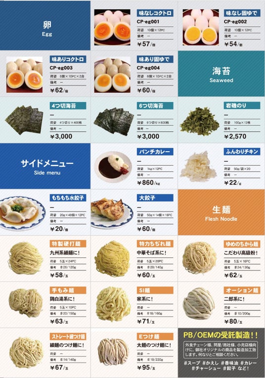 この度、主力商品である鶏、豚の白湯スープ、清湯スープに加え、新たに鴨、鯛、牛、ベジタブルの各種スープの商品を追加しました。更に、ラーメンを作る際に必要な素材である出汁、かえし、油、生麺、チャーシュー、メンマ、卵、海苔の他、サイドメニューの餃子やカレーまで数多くの商品をラインナップさせて頂きました。