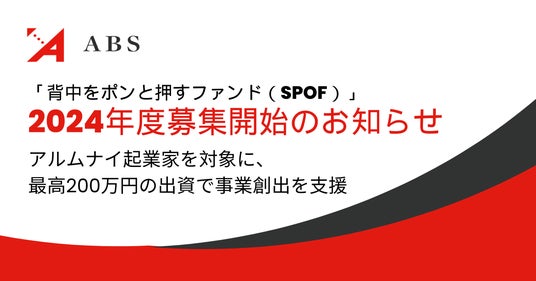 このたび、Aoba-BBTのグループ会社である株式会社ABS(所在地:東京都千代田区、代表取締役社長:伊藤泰史、以下ABS)が主導するスタートアップ起業家支援プロジェクト「背中をポンと押すファンド(SPOF)」の2024年度募集を開始する運びとなりましたのでお知らせいたします。