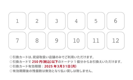 ドーナツ12個引換券(表) ご購入いただいた日から引換期限の2025年3月31日まで、店舗で引き換えいただけます。