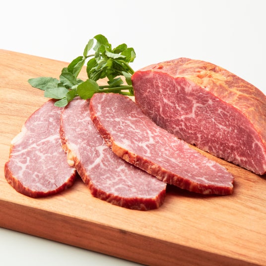 モッタイナイビーフ 黒毛和牛ベーコン大きく育ちきらなかったために市場に出回る機会がなかった黒毛和牛の希少部位“ザブトン”部分を使用。そのまま生で食べていただくだけで黒毛和牛の上質な脂の旨味をお楽しみいただけます。